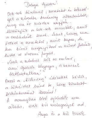 Ez a kis levélke annyira meghatotta, mert tudja, hogy szeretjük, tudjuk, hogy szeret, de az élet gyarló és aki azt mondja, hogy nyugalomban és békességben él és élnek mindig, az hazudik! Ha meg fáradt az ember, mint ahogy Ő a sok-sok munkában elfáradt, aki annyit túlórázik, "tizenkétórázik", majdnem minden szombaton is bemegy, az megérdemli a felmentést.