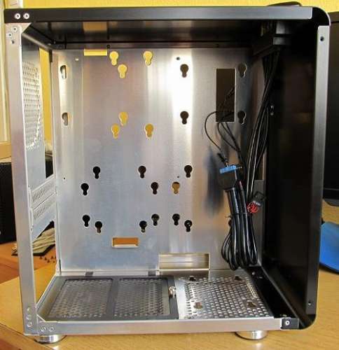 Az alaplaptartó tálcán található kivágásokból egyesek már kitalálhatták, hogy itt bizony lehetőségünk van a kábelek elrejtésére. Ezt a gyártó büszkén is hirdeti, miszerint ez az első mini-ITX-es kuckó, ahol lehetőségünk van az alaplaptálca mögött elrejteni a kábeleinket.