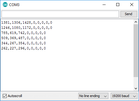Ha sikerrel jártatok, és megnyitjátok a Tools → Serial Monitor-t, már láthatjátok is az Arduino által küldött mérési adatokat: négy ventilátor fordulatszámát, utána pedig a hozzájuk tartozó négy fokozatot százalékban. Az üresen hagyott ventilátorhelyeken 0-át fogtok látni. Én három ventilátort használok, melyek a képen épp 0%-on pörögnek.
