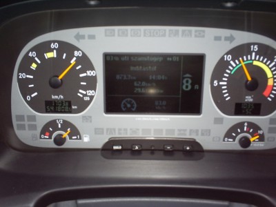 A szerelvényről pár szó: ugye azt írtam, hogy a vontató egy MB 1844 Actros,midi vontató. 3 éves múlt, ez is full automata, 540000 kilométer van a számlálójában, tehát meg „férfikora” elején jár. ( a mai vontatok, optimális esetben jóval egymillió kilométer feletti futásteljesítményt is tudnak, nagyjavítás nélkül). Nincs lelakva, nem volt törve, nemdohányzó gazdája volt eddig. Lassan ismerkedek vele, ami először is abból áll, hogy gyorsan megszokjam, itt egy lépcsővel több van, mint a többi autónál. Jókat spárgáztam már pár alkalommal kiszálláskor. Nem akarok „varrás mentén repedni…” Nagyon nagy a fülke, teljesen sík padlóval, két fűthető, ezerféle képpen állítható üléssel, mit üléssel, szabályos fotellal, hűtővel, tárolófiókkal a hűtő alatt, (amolyan kis spájz…) hatalmas rekeszekkel a ruhák, meg minden számára, mindkét oldalon pohár és palacktartókkal, klímával, kiegészítő fűtéssel, ami külön programozható,(nem ugyan az, mint az állófűtés, itt ugyan úgy a fűtő-hűtő nyílásokon nyomja be a meleg-hideg levegőt, mint a saját motorfűtése, tehát szélvédőre, mindenhová áramlik a levegő, nincs reggelre csöpögő pára az ablakokról, és beállítható a hőmérséklet fokonként). Kívül nem kettő, hanem négy (oldalanként kettő) rekesz van a kocsin, két nagyon nagy, és kettő kisebb a szerszámoknak. A műszerfal, meg egyáltalán az egész belső kialakítás szép, funkcionális, esti kivilágításban, mint egy repülőgép cookspitja. Bármerre nézek, mindenhol halványan fluoreszkál valami piktogram, vagy kapcsoló. Csak a belső világítást négy-ötféle képpen lehet variálni, a rádió, meg a fűtés-hűtés pedig mindkét ágyról külön panellal vezérelhető. A váltó mint írtam, itt is automata, (választható manuális üzemmód is) összesen 16 előre és két hátramenet fokozattal. Természetesen a difizár, kipörgésgátló, ABS innen sem hiányzik. A pót meg egy dobozos, tehát fix oldalfalú SCHMITT, nem kell ponyvázni, és spanizni sem. Nagy előny ez télen-nyáron, különösen inkább ilyenkor. És felvágni sem egyszerű… Tehát talán sikerül kifogni egy jó összeállítást, még a fogyasztásra leszek kíváncsi.