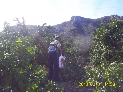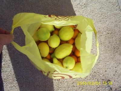 Egy megállással, valamivel 11 óra után a célállomáson voltunk, a cég előtt álltam meg és kérdeztem meg egy benzinkutast, ugyan merre van ez és ez a firma. Rezzenéstelen arccal az utca túloldalára mutatott, ahol vészvillogóval állt a kocsi. Tényleg kb 3 méteres betűkkel volt az épület falán a cég neve, a kocsitól talán öt méterre… Bejelentkeztünk, leadtuk a CMR-eket, és vártunk a sorunkra. Két órával később már itt, egy parkolóban álltunk, néhány kilométerrel odébb. Azt már idefele elhatároztam, hogy én ma narancsot fogok enni. Azt is, hogy szedni fogok, fárol. A parkoló két oldalán is narancs és citrom ültetvények vannak, így kollégával egy-egy reklámszatyorral felszerelkezve, bevetettük magunkat a fák köze, és röpke fél óra alatt vagy 10 kilónyi mandarint, narancsot, illetve pár szem citromot zsákmányoltunk. Ezúton is elnézést kerek a tulajtól, maradt ott még annyi, hogy nem ettől fog tönkremenni… Persze közben a szánkba is tömtük derekasan, plusz én még fényképeztem is, hisz bevallom férfiasan, meg sosem szedtem fárol narancsot, sőt, ha belegondolok, meg narancsfát sem nagyon láttam „élőben”. Közben az is elgondolkoztatott, hogy ha már most, március elsején érett gyümölcstől roskadoznak a fák, akkor mikor érik? Vagy itt egyáltalán nincs tél? Komolyan mondom, nem tudom a helyes választ, de utána fogok nézni, ha internetközelbe kerülök. Mindenesetre degeszre ettük magunkat az alig gyerekökölnyi mézédes mandarinnal, meg naranccsal, pillanatnyilag úgy érzem, rá sem tudok nézni. Kezem-szám ragad tőle, egyelőre elég volt. Jó lenne, ha én is hazafele kanyarodnék, akkor hazavinnem a többit, biztosan megvan vagy 10 kiló.