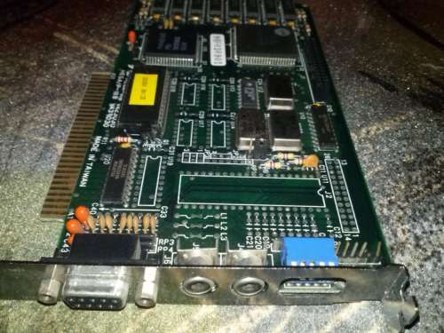 Jól látható, hogy a kártya hátuljára kerültek a memória IC-k, amelyek összesen 128 KB-ot tesznek ki. A kimeneteknél megtaláljuk a 2 soros csatlakozójú EGA monitor kimenetet (amire akár CGA monitor is köthető) illetve láthatunk még kompozit kimenetet is. Továbbá láthatunk egy furcsa kapcsoló sort, erre azért volt szükség, mert a 80-as években még a felbontást nem szoftveresen állítottuk, hanem ezekkel a kapcsolókkal.