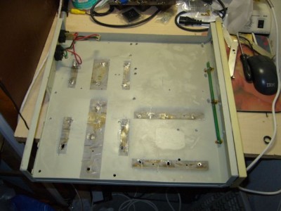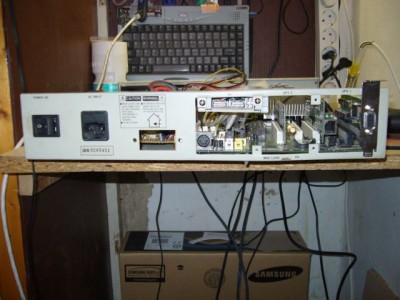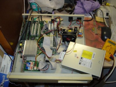 A legnagyobb problémát a doboz kiválasztása okozta. Nem akartam sima PC házba szerelni, mert nem igazán tudtam volna hova elhelyezni. A műhelyemben van egy szekrény a falra felszerelve, a tetején volt némi holt tér. Logikusnak tűnt ezt a helyet kihasználni erre a célra. Viszont ide egy laposabb doboz kell a sima PC-ház nem fér el! Volt egy pár leselejtezett régi típusú UPS-em aminek szép nagy lapos doboza van. Ahogy néztem elfér benne egy alaplap meg egy táp és még a HDD mobil rack is. Nosza essünk neki, kibeleztem.