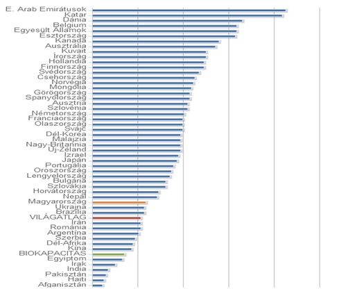 Egy 2007-es adat áll rendelkezésemre, ahol az Arab emirátusok a listavezető 10,7 hektárral. Az Egyesült Államok 8 hektárral, Belgiummal egy szinten. Mi valahol az egészséges középen helyezkedünk el 3 hektárral. Ezen lista végén pedig Afganisztán szerepel, ahol ez a szám 0,6 hektár. Az ábrán még szerepel két adat a világátlag (2.7) és a biokapacitás(1.8). A biokapacitás az az érték, ami a föld megújulási határa jelenleg. Szóval e mutatók szerint másfél földre volna szükségünk. Ami azért nem rossz.
