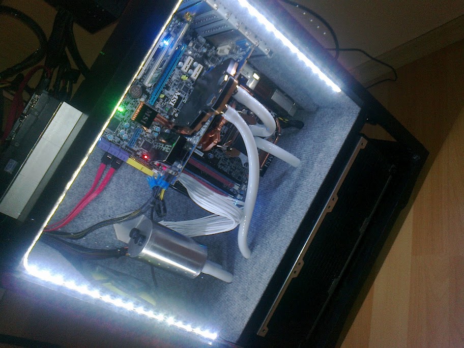 Közben szét kellett szerelnem a még most is használatban lévő Chieftec gépházamat, mert kellett belőle az alaplapi tálca, és a PCI hátlap. Szép móka volt a vízhűtéses rendszer leereszteni, a kellő részeket kioperálni a házból, és mindent visszatenni.
