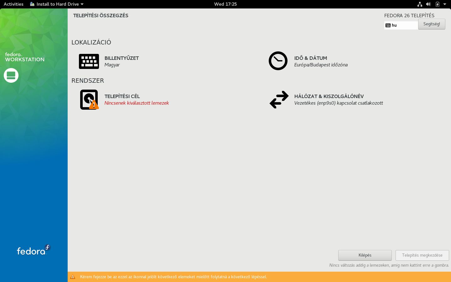 A Folytatásra kattintva már az összegzést mutatja. A lokalizációt megadtuk az előző oldalon (Magyar), az időt és dátumot is ehhez igazítja (Európa -» Budapest időzónája). A hálózati kapcsolatot is felismerte, majd automatikusan bekonfigurálta azt. Egyedül a rendszer jelez problémát egy kis narancs háromszöggel: Nincsenek kiválasztva lemezek.