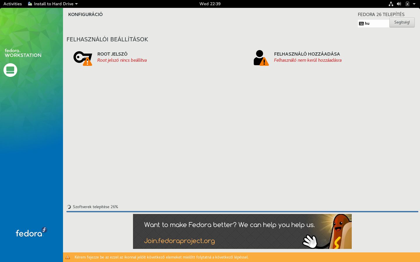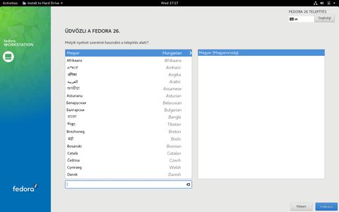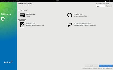 Ekkor elindul az Anaconda, a Fedora telepítő programja. Ez végigvezet minket a telepítés folyamatán, és megpróbálja a lehető legegyszerűbbé tenni azt. Elsőként a nyelvet kell kiválasztani. Élő internetkapcsolat esetén magától kitalálja, hogy a magyar nyelvet szeretnénk kijelölni, hiszen Magyarországon vagyunk.
