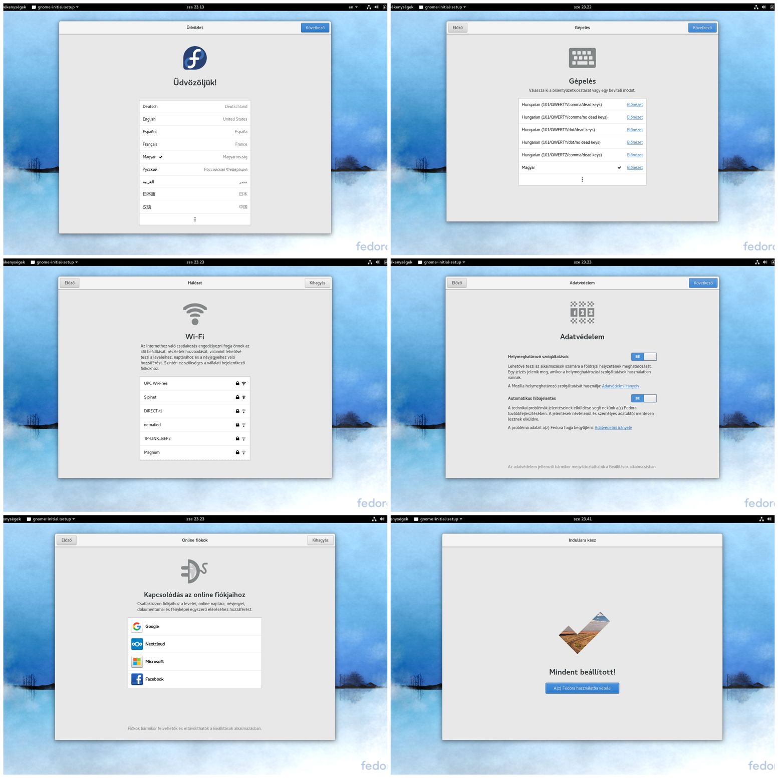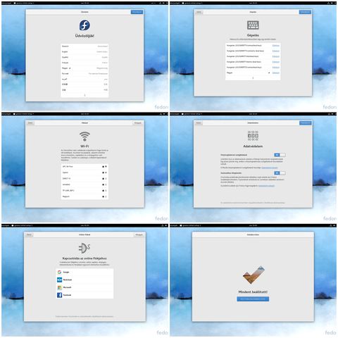 A Konfiguráció befejezése gombbal véglegesítjük a beállításokat, majd nem marad más hátra, mint kilépni a telepítő programból. Indítsuk újra a gépet. Kattints a jobb felső sarokban a lefele mutató nyilacskára, majd a legördülő menüben a kikapcsoló gombra. Belépve a frissen telepített Fedorába, egy varázsló segít az első lépések megtételében. Hagyjuk jóvá a magyar nyelv használatát, majd jöhet a billentyűzetkiosztás, a Wi-Fi, az adatvédelem, végül az online fiókok beállítása. Természetesen ezeket később is beállíthatjuk, módosíthatjuk.