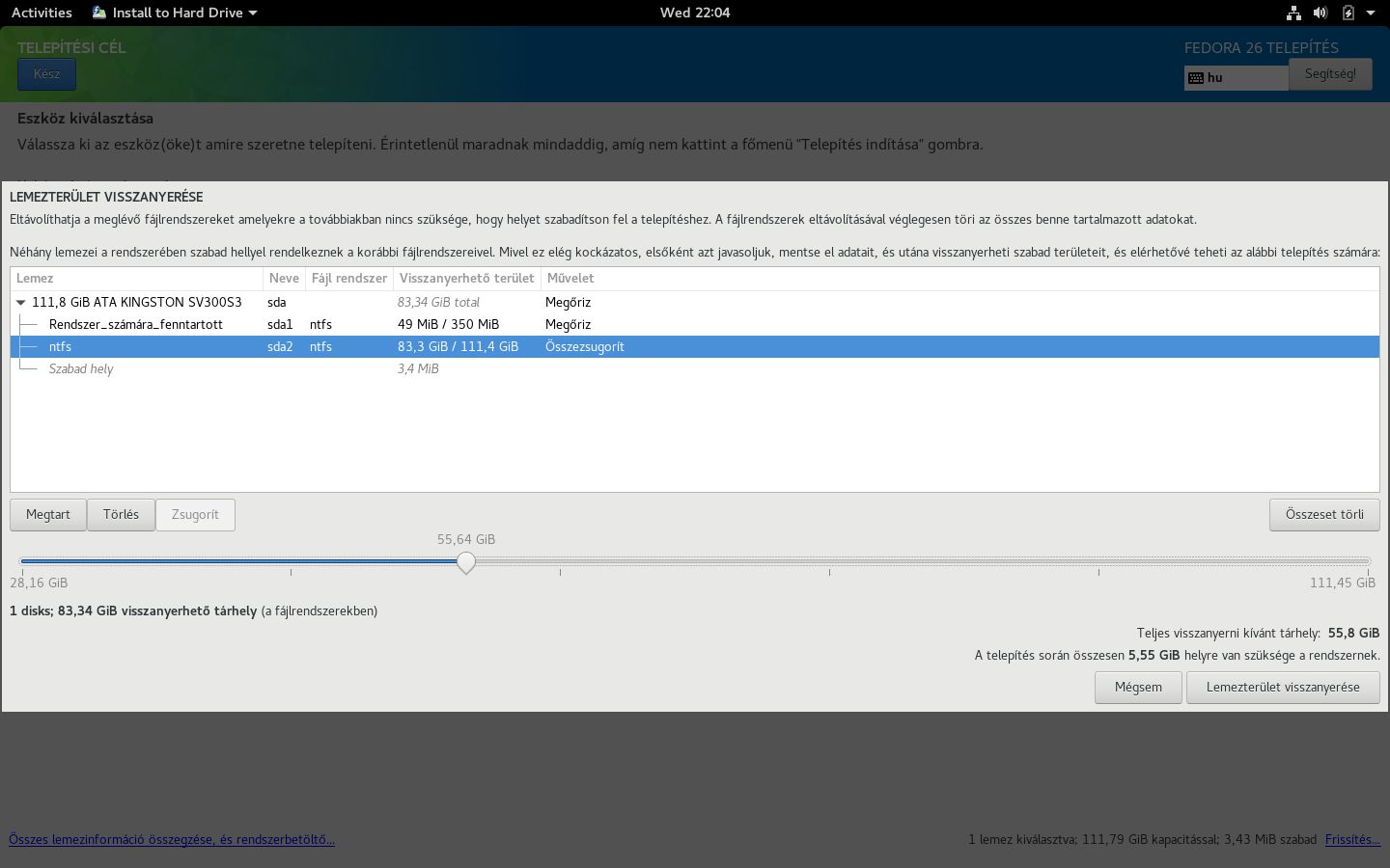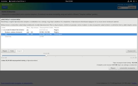 Kicsit trükkös a dolog, mert nem 0-ról indul a csúszka, hanem a Windows-os rendszer által elfoglalt terület méretével. Esetemben ez 28 GB. Ahogy húzod a csúszkát, úgy mindig újraszámolja a "C:" partíció és az üres terület méretét. Miután beállítottuk, mekkora üres helyre van szükségünk a Fedora-hoz, nyomjuk le a Lemezterület visszanyerése gombot. Ezzel véglegesítjük a döntést, és visszajutunk a telepítést összegző oldalra. A hibajelzés eltűnt, sikeresen beállítottuk a telepítési célt.