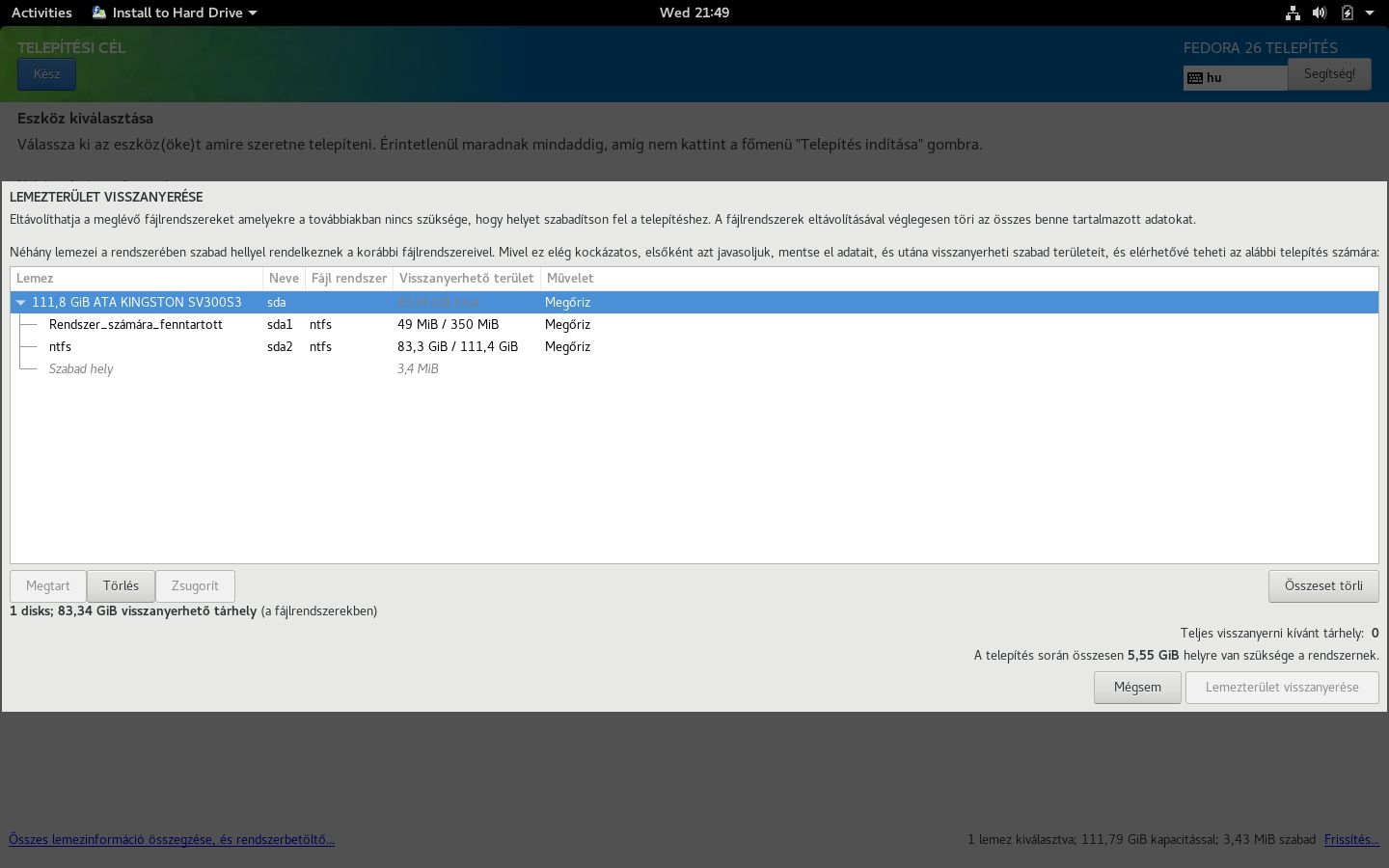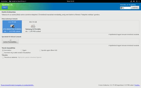Itt az idő megadni a telepítési célt, vagyis azt, hogy a számítógép melyik merevlemezére kerüljön a Fedora. Kattintsunk rá. Ekkor kilistázza a számítógépbe épített merevlemezeket. Az én gépemben egy 120 GB Kingston SSD van, ill. egy 500 GB-os Samsung hordozható merevlemez. Jelöld ki azt a merevlemezt, amelyikre telepíteni szeretnéd. Én az SSD-re fogom telepíteni.