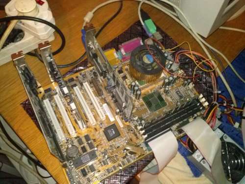 Alaplapból azért ezt választottam, mert volt még rajta ISA kártyáknak fenntartott foglalat, így a jó öreg 3Com LAN kártyát bele tudtam rakni, ami garantáltan működik Windows 3.11 alatt. Hangkártya szintjén azért az ALS4000-es landolt az egyik PCI sínben, mert Windows 3.11-től egészen Windows XP-ig van hozzá driver, és ugyanez elmondható az S3 Trio3D/2X VGA kártyáról, ami AGP csatolós. Az alaplapba eleinte azért csak 256 MB RAM-ot raktam, mert tudtam, hogy a régebbi Windows-ok nem nagyon csípték, ha ennél több memória volt.