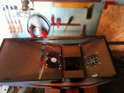Ja igen, kiszereltem egy régi tápból a ventillátort, ez USB-n keresztül kapja a Voltokat. A levegőt befelé fújja, az ellentétes oldalon meg csak egy ugyanolyan rácsot tettem, hogy szabadon távozhasson is a levegő. Nem tudom hatásos lesz-e, de nem is ez volt a lényeg, mivel nincs a laptop alján burkolat, talán ez is hozzájárul a hőmérsékletcsökkenéshez egy kicsit. Rákötöttem még két kék Led-et (ez a mániám) és az egészet ki-be lehet kapcsolni egy kapcsolóval. Hasznos, innen lehet látni, hallani, hogy megy a gépezet az asztal csukott állapotában.