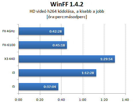 A WinFF 100%-on hajtja az összes rendelkezésre álló szálat. Ez fekszik az FX-nek és bár az i5-öt nem tudja beérni, de az i3-mat szépen lenyomja. Az X3-hoz képest kb. feleannyi idő kell a konvertáláshoz.
