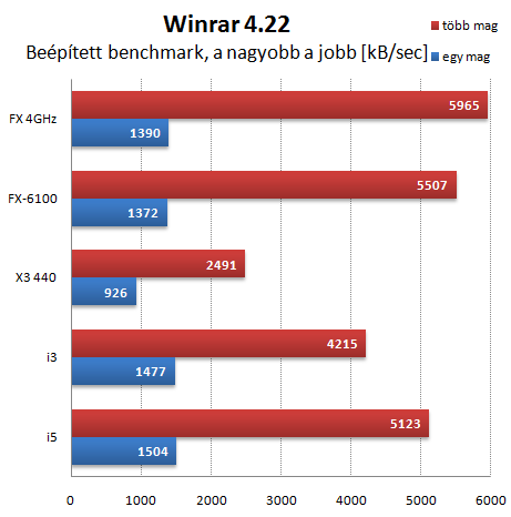 A Winrar eredmények single thread esetén az eddig leírtak szerint alakultak. Egy szálon lemarad az FX, több szálon viszont magára talál és még az i5-öt is lehagyja. Tuninggal gyorsult a rendszer, még ha nem is az órajel emelésével arányosan.