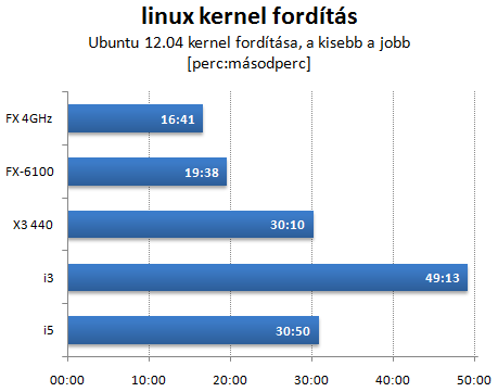 Kernel fordításnál ismét előnybe kerül az FX. Méghozzá hatalmas előnyre tesz szert, még az i5-höz viszonyítva is. Az i3 2.5x annyi időt igényel. A tuning hatása is végre elég jól érzékelhető.