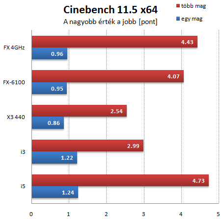 Cinebench alatt ismétlődik a megszokott sorrend. A Bulldozer egy szálon lassabb, mint az Intel. Több szálon viszont simán megveri az i3-mat. A tuning csak több szálon jelent előnyt, a TC 3.9 GHz-en járatja egy szál esetén a processzort, ami csak 100 MHz-es eltérést jelent.