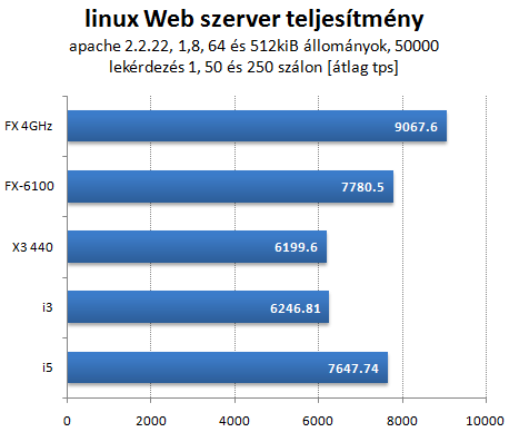 Az apache is jól ki tudja használni a sok integer végrehajtót. A 12 teszt átlaga alapján még az i5-öt is le tudja nyomni még alapjáraton is, igaz csak paraszthajszállal. Tuningolva már érezhető az előnye. Persze ez csak akkor igaz, ha több szálon terheljük a webszervert.
