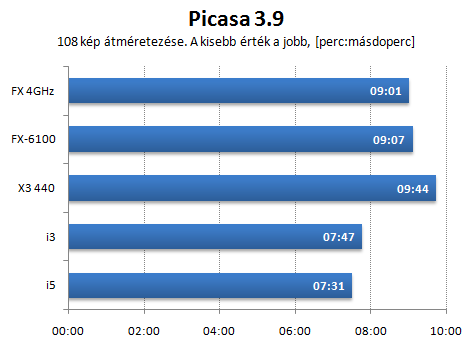 A Picasa egy szálon végzi a konvertálást, ez meg is látszik az eredményeken. Az Inteleket meg sem tudja közelíteni az FX és a tuningnak sincs semmi hatása. Az X3-mat azért még így is kényelmesen lehagyja.