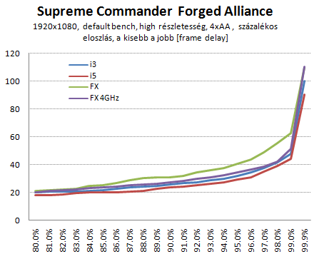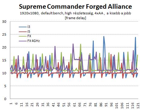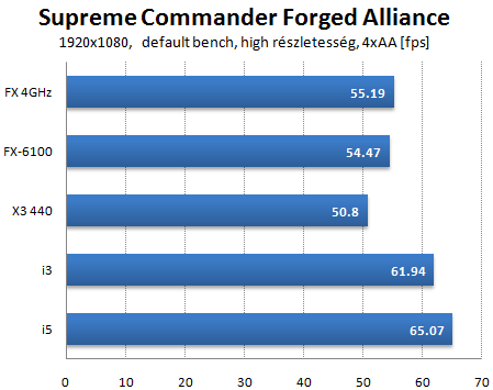 A hosszú nevű Supreme Commander Forged Alliance minden esetben 0 fps minimumot produkált. Az FX átlaga jóval az Intelek alatt marad még tuningolva is. Hasonló régebbi egy magot jelentősen terhelő programoknál ez nem ritka. Érdemes végiggondolni, hogy mire szeretnénk használni a gépet, mielőtt FX-et veszünk.