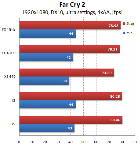 A Far Cry 2 lassan kezd kiöregedni a tesztek közül. Rendesen feltekertem a részletességet, a 4x AA full HD felbontás mellett rendesen megterhelte a gépet, de még így is bőven 30 fps felett maradt végig a teszt. Láthatóan vegyes limit van, az FX single thread teljesítménye korlátozza az elérhető fps-t, nem tiszta a GPU limit. A minimum és átlag fps is szépen nőtt a tuning hatására.