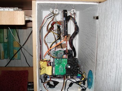A képen még nem láthatóak a vinyók, csak az a kábeldzsungel, ami végig jellemző a projectre. Itt még a gép egy valamilyen 939-es proci volt, elvileg X2 tuningolva, mellé egy 2600XT vidkari vmodolva.