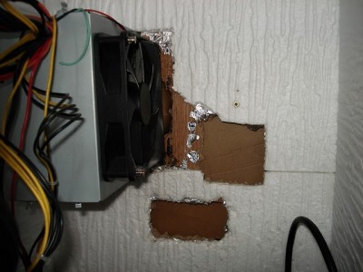 A nagy 12-es venti (5V) mögött karton papír feszül, oldalra irányítva a kijövő levegőt, és némiképpen csökkentve a hangját. A kis lukon lent egy befelé fújó 8cm-es venti volt 5V-re kötve, ami friss levegőt irányított a videokártyára, ez még később szerephez jut.