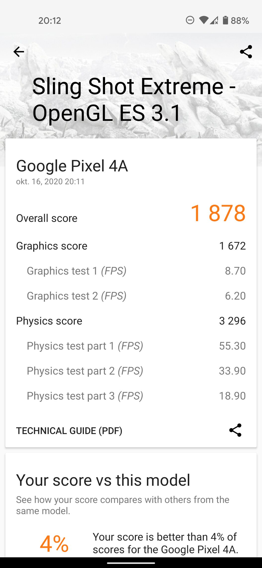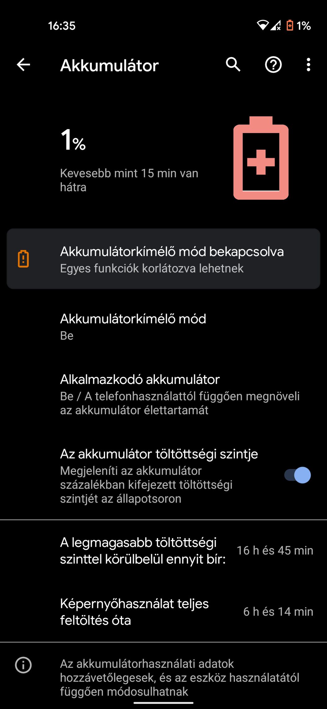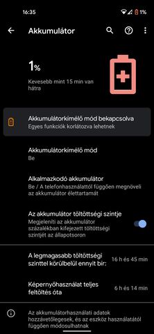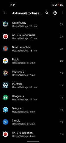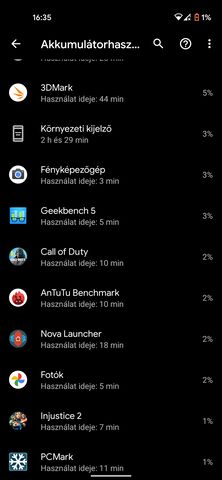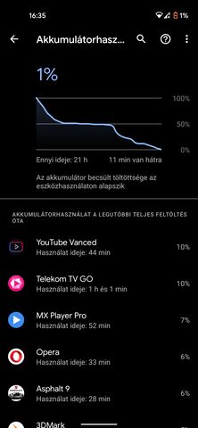 A készülékben egy 3140 mAh teljesítményű akkumulátor van. Az első merítési ciklusban lefuttattam pár tesztet – Antutu, Geekbench 5, 3D Mark, Pc Mark. Kipróbáltam a fent említett játékokat kb. egy órán keresztül. A Telekom TV Go, YouTube Vanced és az MX Player 50%-os fényerő mellett összesen több, mint két és fél órát ment. Internet Opera böngészővel, Reddit, Telegram stb. nyomkodással 21 óra alatt 1%-ra merítve 6 óra 20 perc kijelző időt sikerült elérni. Ez nem egy átlagos felhasználás, de szerintem a 1,5-2 nap is összejöhet.