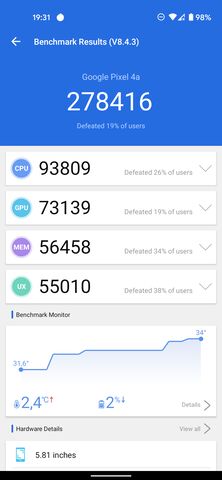 A fizikai méreteket tekintve egy – a mai mezőnyben kompaktnak nevezhető – 144 x 69.4 x 8.2mm-es készüléket kapunk, ami a kameraszigetnél még kb. 1 milliméterrel vastagabb. A készülék súlya 143 gramm, a súlyelosztása jó. Az előlapon egy nem túl vastag káva szegélyezi az 5,81 colos 1080 x 2340 pixeles, 19,5:9 képarányú 443 ppi-s HDR OLED kijelzőt. A panel csak 60 Hz-es képfrissítést tud. A kijelző manuálisan 451, adaptív módban pedig 830 nit körüli maximális fényerővel rendelkezik. Erős napsütésben a láthatósága remek. A betekintési szögek jók. Az előlapra – a 3a-s Asashi Dragontrail helyett – újra a Corning szállítja a 3. generációs Gorilla Glass védőüveget.