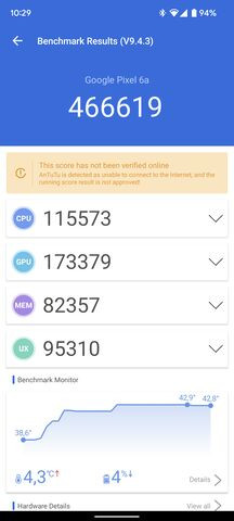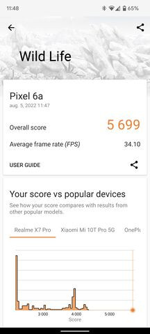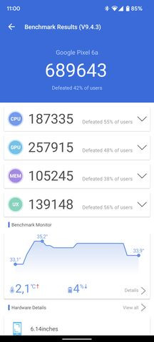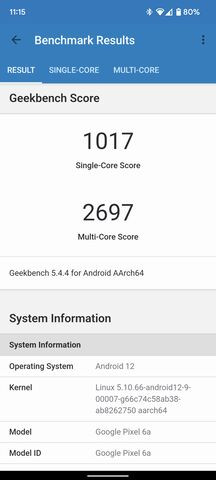 Itt megismételhető ugyanaz, amit korábban, a Pixel 6 tesztjénél írtam, hiszen a processzor megegyezik az ott használt Samsung által fejlesztett Tensor chippel. Két darab Cortex-X1 mag mellett két darab régi Cortex-A76-os magot használnak, amit még kiegészít négy darab Cortex-A55 –ös mag. Az X1-es magok 2,8 GHz-re képesek, a középső klaszter 2,25 GHz-re, a legkisebbeket pedig 1,8 GHz-re skálázták. Az IGP feladatait egy Mali-G78 MP2 látja el.