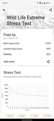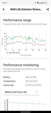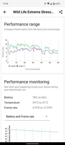 Geekbench esetén már nem volt ennyire érezhető eltérés. Wildlife Extreme Stress Test esetében azonban látható, hogy a huszadik loopra a frame rate rendesen visszaesik, ha nincs a hűtő a közelben.