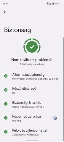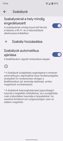 Bloatware programok nem nagyon vannak. Az alapprogramok mellett csak a Biztonság, a Hangfelvevő és a Pixel tippek alkalmazásait fogjuk megtalálni első indításkor. A gyári zene alkalmazás változatlanul a YouTube Music. Az alap Android gyári gesztus alapú navigációja mellett elérhető a korábbi három gombos navigáció is. Idegesítő módon a bekapcsológomb hosszú lenyomásával alapból nem a kikapcsolási menü fogad, hanem a Google Asszisztenst indítja a készülék. A hatos szériában jelent meg ez a változás, de a Beállításokban a Kézmozdulatok menü pont alatt visszaállítható a megszokott kikapcsolási menüre. Beállíthatóak korlátozott szabályok, amivel meghatározott Wifi hálózatra való csatlakozáskor vagy elmentett helyen aktiválódnak. A Biztonság menüben lenne egy autó-ütközés érzékelő is, de ez sajnos nálunk és magyarul nem elérhető még.