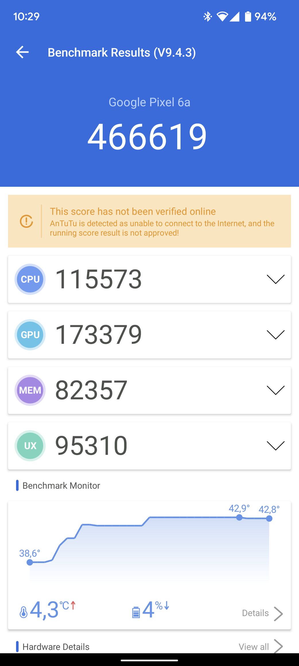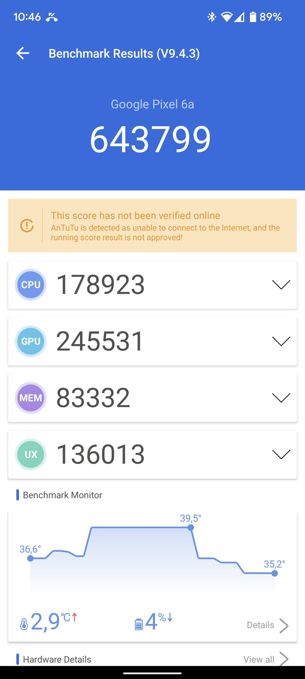 Először az Antutu 466 ezres pontszámot ért el és majd 43 Celsius fokra melegedett. Az ezt követő második mérésnél tokban a laptophűtőn már csak 39,5 fokig melegedett és a teljesítmény is felugrott 643 ezer pontra. Majd tok nélkül és 14 perccel később 689 ezres pontszámot ért el maximum 35,2 fok mellett.
