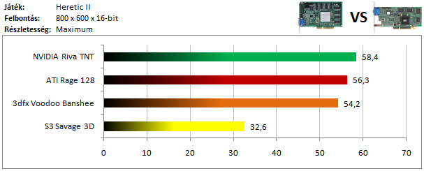 Az erősebbik kártyacsoport csatáját a TNT nyeri meggyőző fölénnyel. A második helyen érdekes módon a Savage 3D fut be, ami mindenképp dicséretet érdemlő teljesítmény. A Banshee-nak ez a teszt nem feküdt, így utolsóként végzett.