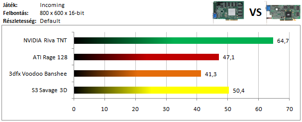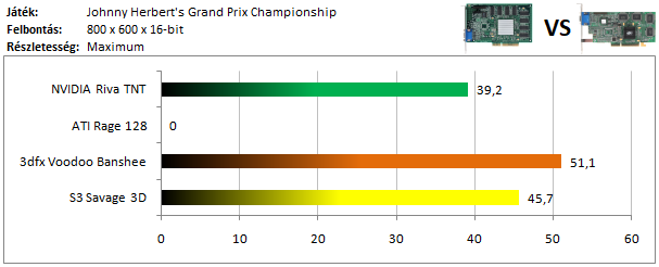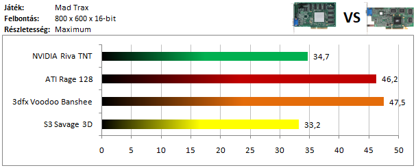 Egy újabb játékot láthatunk, ahol a TNT furcsán gyenge eredményt ér el, és csak a Savage 3D-t képes kis mértékben megelőzni. Nem szerepelt viszont rosszul a Rage 128, ám túlságosan sötét képe nem volt túl tetszetős. A Banshee annak ellenére nyerte meg a tesztet, hogy D3D alatt mértem. Ugyan dedikált Glide mód is rendelkezésre állna, ám azzal sem volt gyorsabb ennél.