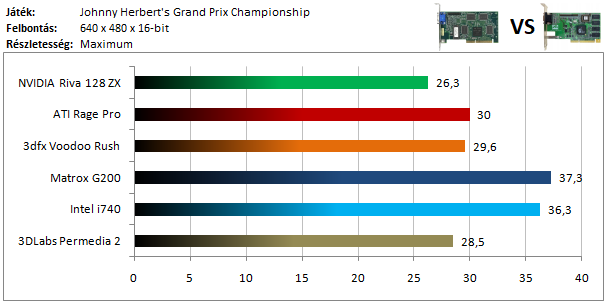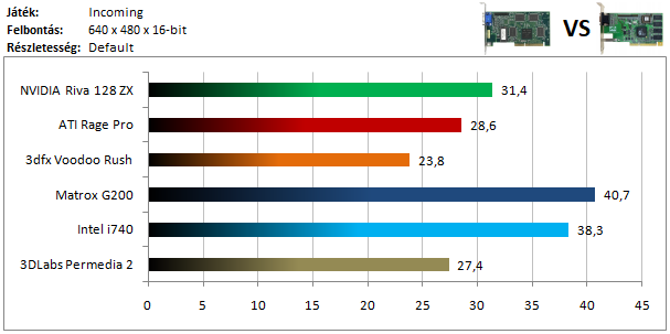 A kisebb kártyák csoportjában a Matrox és az Intel versenyzője küzd egymással az első helyért, és jócskán leszakítják magukról a követő bolyt. A harmadik helyezett Riva 128 már éppen csak játszható sebesséhet ad, a többi kártyával pedig még ennél is gyengébb az eredmény. A Permedia 2 ráadásul bizonyos effekteket pöttyözéssel helyettesített, ami nem volt túl szép látvány.