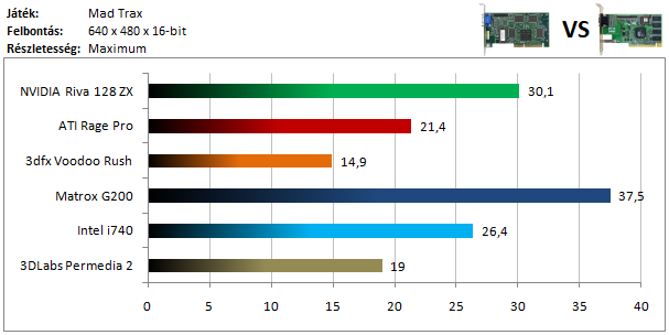 A Matrox G200 győzelmén már nem lepődünk meg, a Rage Pro második helye viszont kellemes meglepetés. Rajtuk kívül még az Intel i740 volt képes játszható sebességgel futtatni a programot, így felfért a dobogó harmadik helyére. Az NVIDIA kártyáinak ez a játék sem kedvez, hiszen a TNT után a Riva 128 is nagyon gyenge eredményt ért el. Az utolsóként befutó Rush-t ezúttal D3D alatt kellett mérnem, mert Glide üzemmódban csak fekete képernyő fogadott vele.