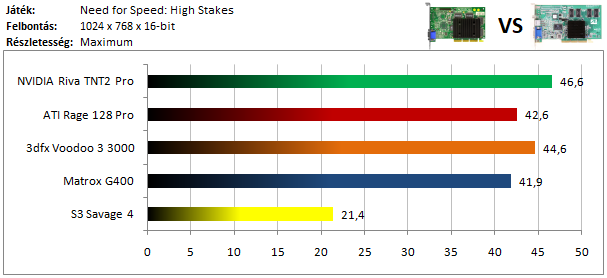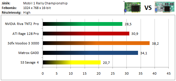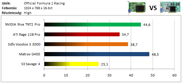 A Matrox G400 nyeri ezt a tesztet a TNT2 előtt, de valami gond volt a részletesség skálázásával, mert az autók csak nagyon közelről jelentek mex maximális kidolgozással. A Voodoo 3 kénytelen megelégedni a dobogó alsó fokával. A Savage 4 már nem képes folyamatos képet adni 1024x768-as felbontásban.