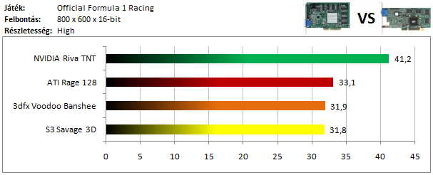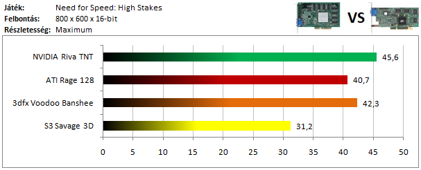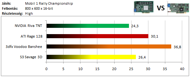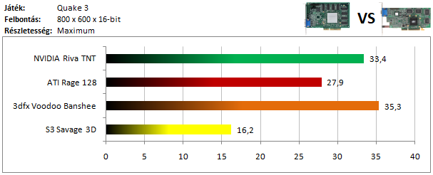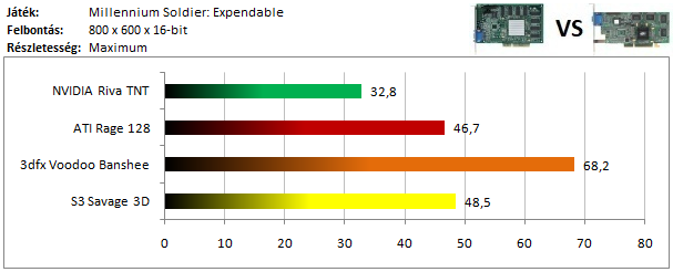A Banshee kis mértékben megelőzi a TNT-t, de a Rage 128 lemaradása már jelentősebb. Ennél is sokkal rosszabbul szerepelt viszont a Savage 3D, mely a rendkívül gyenge teljesítmény mellé iszonyatos vertex hibákat is produkált.