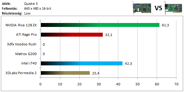 A legkisebb kártyákkal már csak alacsony minőségi szinten élvezhető a játék. A csoport OpenGL-királya egyértelműen a Riva 128. Az Intel versenyzője hatalmas lemaradással fut be a második helyen, a Matrox és a Rush kártyán pedig el sem indult a program.