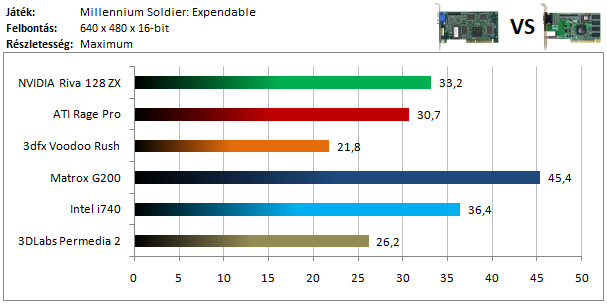 A legkisebb kártyák között már nincs annyira elveszve az NVIDIA, de a Riva 128 teljesítménye így is csak a dobogó alsó fokára volt elegendő. A Matrox G200 győzelmét semmi nem veszélyeztette, de az Intel i740 sem szerepelt rosszul. A Voodoo Rush nem volt képes nagyobb testvérei kiváló eredményét megismételni, és utolsóként végzett ebben a tesztben is.