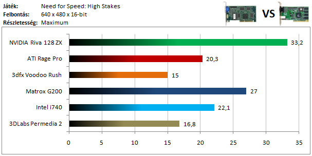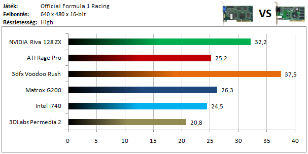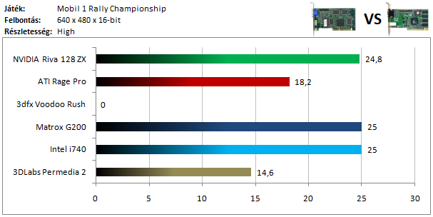 A legkisebb kártyák valamiért 25 FPS-nél limitbe ütköztek, ezt az első három helyezett el is érte. A Permedia 2-vel a gyenge teljesítmény mellett árnyék hibákat is tapasztaltam, a Rush-on pedig el sem indult a program, mert minimum 8 MB videomemóriát igényel.