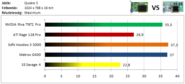 Maximális részletesség mellett (fontos, hogy ez Lightmap fényeket is takar), 1024x768-as felbontásban igencsak megizzasztja a játék a korabeli csúcskártyákat is, melyek közül a dobogósok érdekes módon egymáshoz nagyon hasonló eredményt érnek el. Csak a köztudottan nem túl OpenGL-barát ATI, és a mindig gyenge Savage 4 marad le kissé az élbolytól.