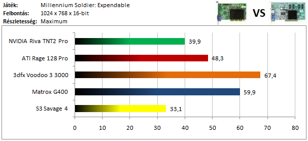 Mint látható, a játék gépigénye elég magas, hiszen a legerősebb kártyák is éppen csak játszható sebességet adnak. A Voodoo 3 végzett az élen, mögötte ismét a Matrox G400 futott be másodiknak. A TNT2 ezúttal sem szerepelt jól, így a Rage 128 Pro is megelőzte. Nála gyengébben már csak az örök utolsó Savage 4 teljesített.