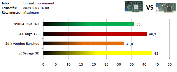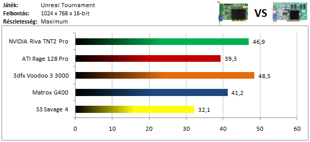 A legerősebb kártyák csoportját a Voodoo 3 vezeti, annak ellenére is, hogy D3D módban lett lemérve, mert Glide alatt kicsivel lassabban futott. Nyomában szorosan a TNT2 halad, míg a Matrox G400 a Rage 128 Pro-val alkot egy szinte azonos eredményre képes párost. A megszokottnál jobban szerepelt a Savage 4 is, hiszen az UT azon kevés játékok közé tartozik, melyek támogatják az S3 Metal API-ját, így ilyen üzemmódban sikerült lemérnem.