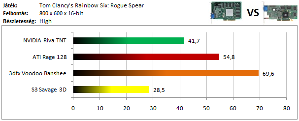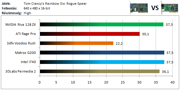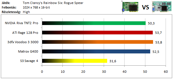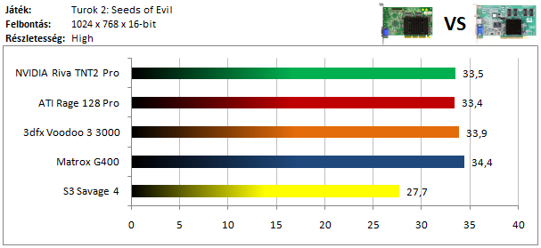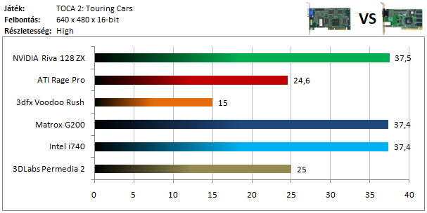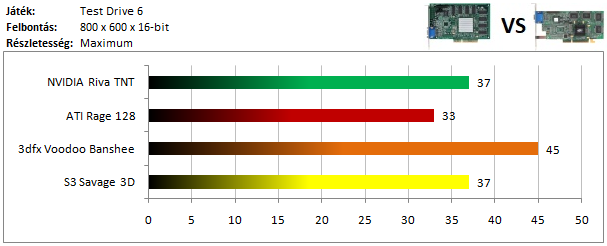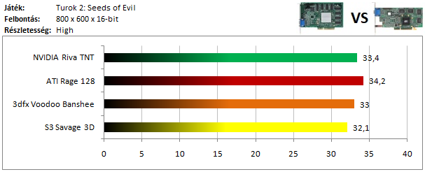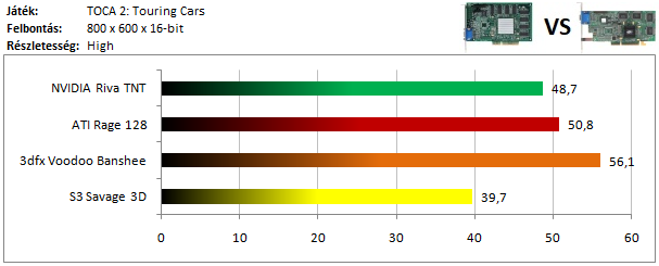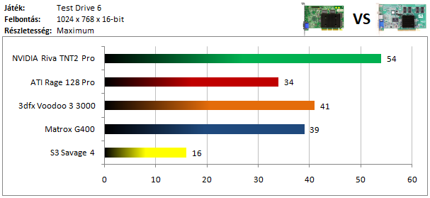 A legkisebb kártyák közül már csak a Matrox G200 volt képes játszható sebességgel futtatni a programot, míg az ATI versenyzőjével el sem indult a játék. Szokatlanul jól szerepel viszont a Voodoo Rush, így dicséretet érdemel.