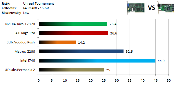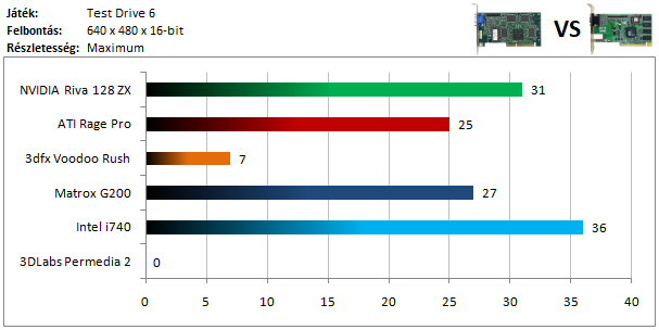 A legkisebb kártyák közül már csak az első két helyezett nyújtott élvezhető sebességet, annak ellenére is, hogy a grafika minőségét alacsony szintre vettem vissza. Az Intel i740 hatalmas előnnyel vezet, a Riva 128 pedig a gyenge teljesítmény mellé enyhe grafikai hibákat is produkált.