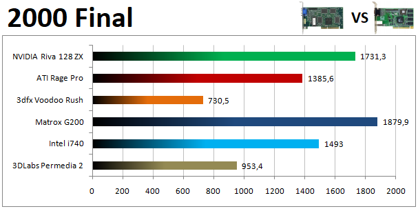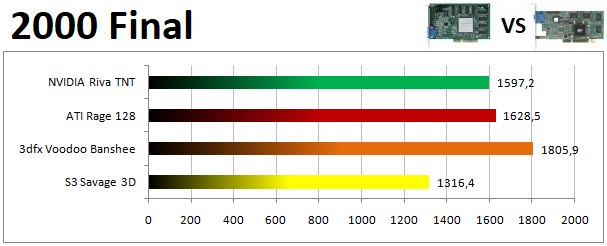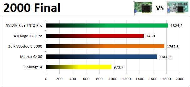 Az előző évben kiválóan szereplő Matrox G400 kicsit visszaesett összetettben az idén, így a TNT2 legfőbb kihívójává a Voodoo 3 lépett elő. Fontos megjegyezni ugyanakkor, hogy a 3dfx kártyájának limitációi, elsősorban a többi versenyzőnél gyengébb textúrafelbontás egyre több játékban eredményezett komoly képminőségbeli hátrányt. A Rage 128 Pro és a Savage 4 hátránya is növekedett az előző évhez képest.