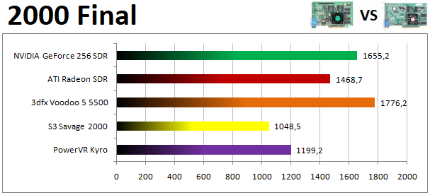 Az idei év nagy durranásai a HW T&L támogatású típusok voltak, de az összetett versenyt mégis egy legendás gyártó utolsó modellje, a Voodoo 5 5500 nyerte meg. Ezt az eredményt látva igazán elszomorító, hogy az év végén a 3dfx csődbe ment, így egy potens szereplővel szegényebb lett a piac. A GeForce és a Radeon csatáját az NVIDIA versenyzője nyerte, nem kis részben azért, mert az ATI kártyájával két játék is megmakacsolta magát, és nem indult el vele. A PowerVR Kyro és az S3 Savage 2000 a vert mezőnyben szerepelt már ebben az évben is.