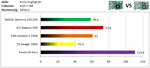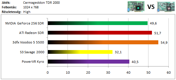 A Voodoo 5 vezeti a legerősebb kártyák mezőnyét, de a dobogóra felfért Radeon és GeForce lemaradása sem magas. A Kyro már jókora hátrányt szedett össze, de még így is meg tudta előzni a Savage 2000-ret.
