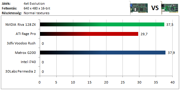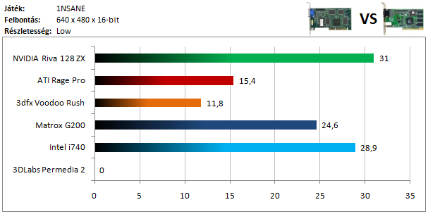 A legkisebb kártyák közül már csak a Riva 128 volt képes játszható sebességet produkálni a legalacsonyabb minőségi szinten. Ráadásul a többi versenyzővel extrém mértékű képhibák is jelentkeztek, ami teljesen élvezhetetlenné tette a játékot.